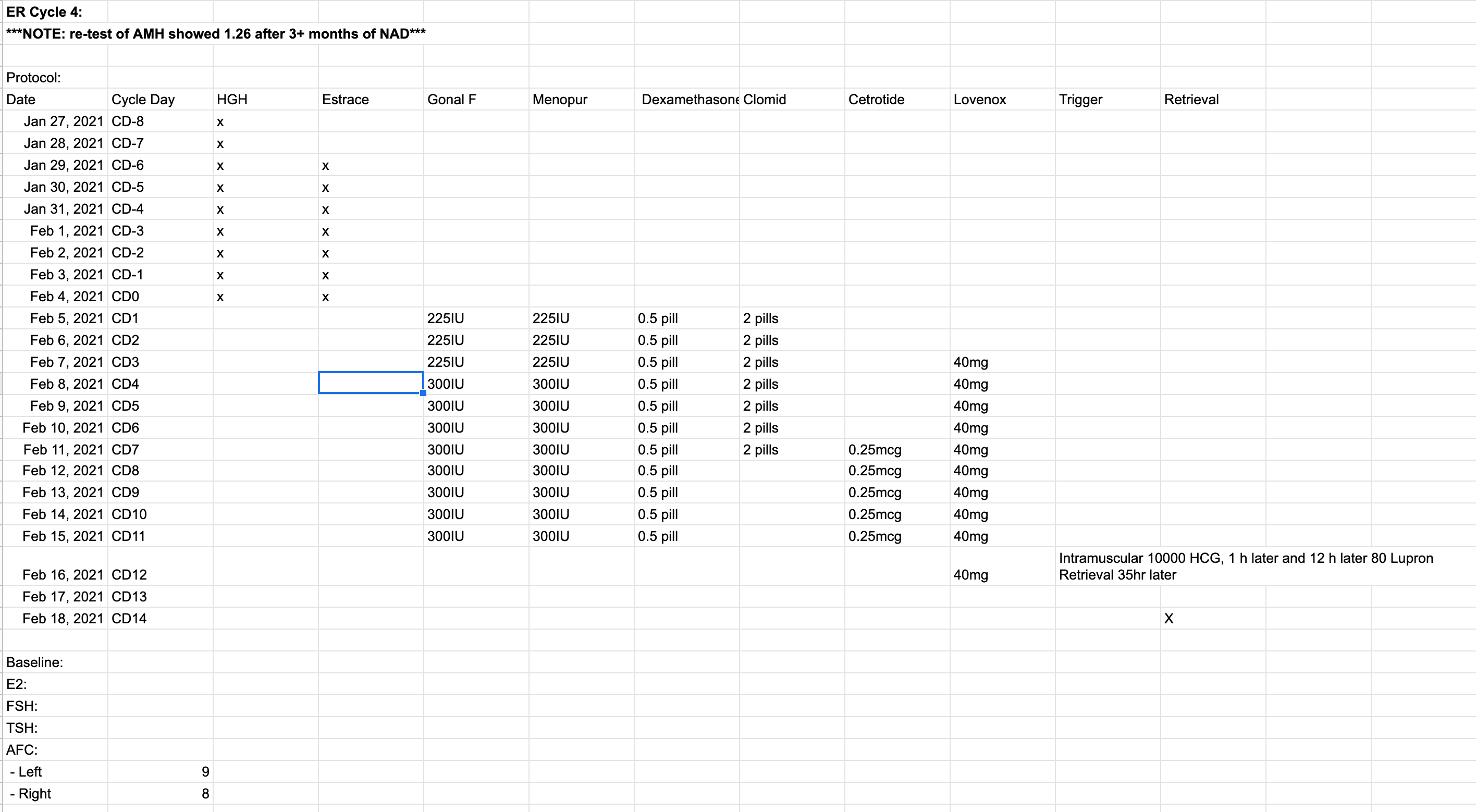 July '22 egg retrieval same protocol: 9 days of stims; AFC 8; 10 retrieved, 8 mature, 4 fertilized and frozen.