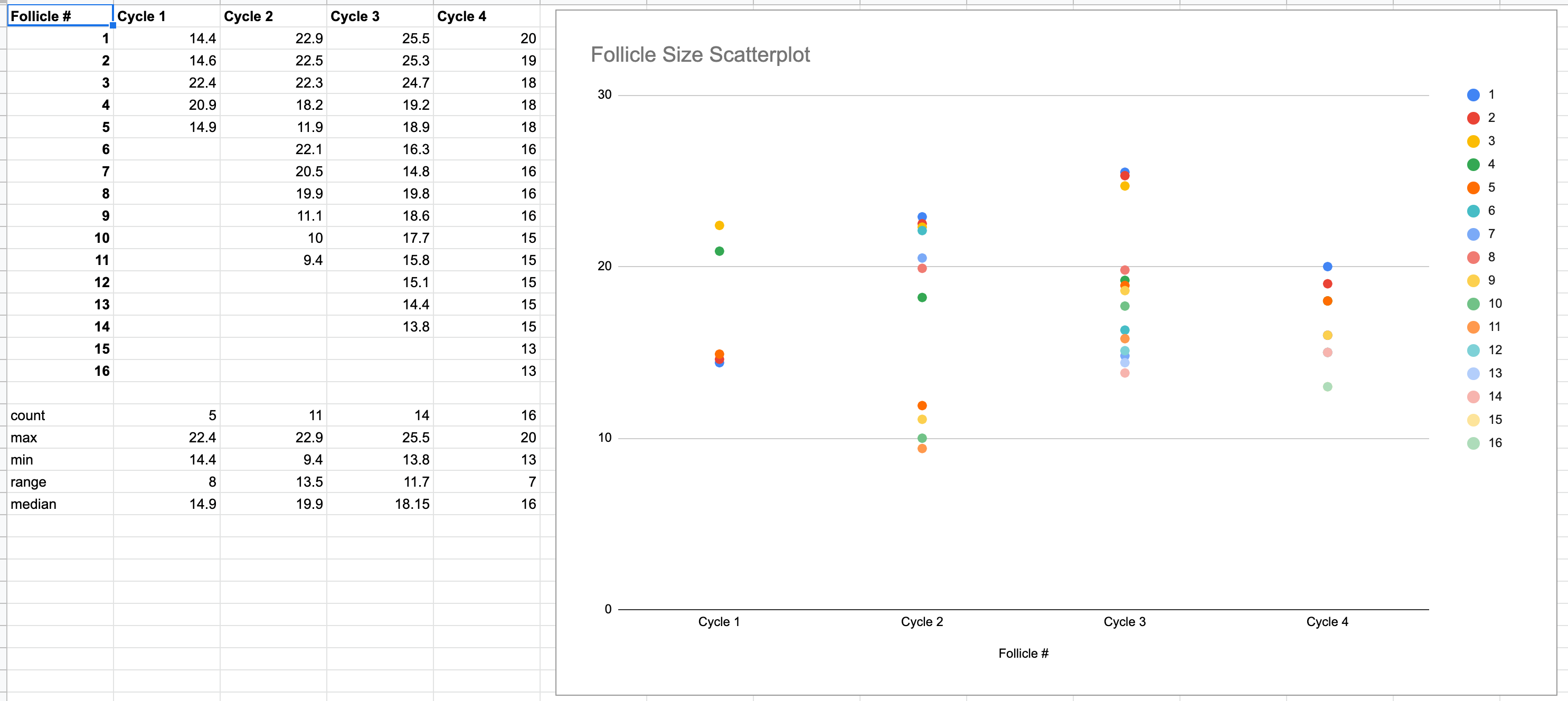 @bumblebee0210 thanks for sharing that protocol w/ us. I've seen it before and I think it's actually gonna work really well for you. A DOR friend of mine (met on another fertility forum) did 4 ERs last year (just oocyte freeze-all, no fertilization) and 3 of 4 of her protocols resulted in quite a gap between a crop of large follies, and a crop of additional smaller follies. Well, then she was put on that exact protocol (except the addition of HGH; she's 36) and it made A HUGE difference. Here are some charts for you (note: only sharing details of the final protocol; however the follicle scatterplot will give you an idea how it worked better than the other protocols. I have those details too and can DM them to you):