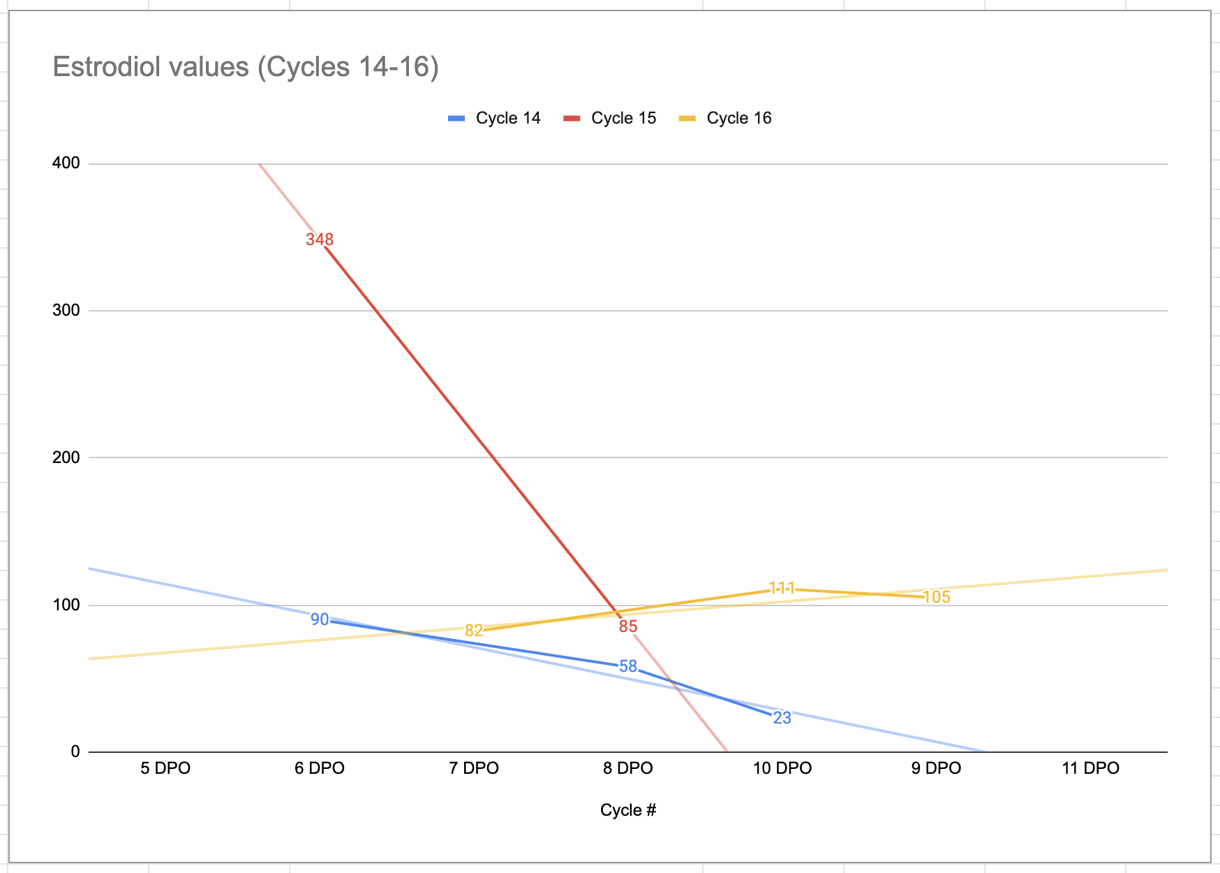 I also have an update on my "progesterone study" since I continued it last cycle (also E2 levels). I did hCG micro-dosing with 20 units (i.e. 200IU) every day from 3-10DPO and also 200mg of prometrium 3-13DPO, and it really helped keep my progesterone levels up! Then again, when I brought this up with our new RE, he did confirm that vaginally inserted prometrium / endometrin delivers progesterone locally, so it won't reflect in the blood very much. But that doesn't mean that I don't have enough progesterone in the uterus. Anyways, enjoy these graphs & charts.