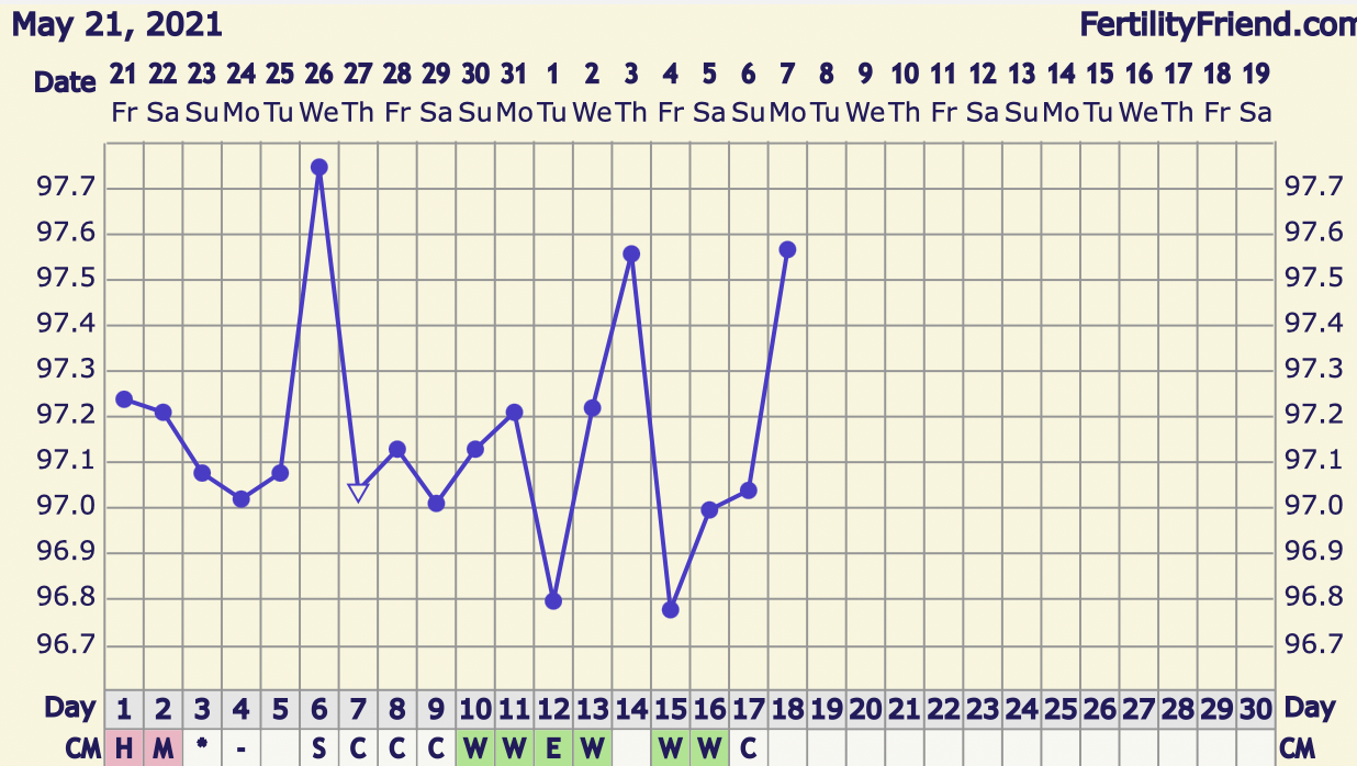 CS/Q: I think I may have ovulated in the last couple of days, could be CD 17 or 18, only because today's temp was a "normal" 1-2 day post ovulation temp  Like 60% sure. Of course I slept in yesterday (1 hr later) and had a high temp, and in general have slept poorly all weekend because I have a cold, so who knows 🤷‍♀️