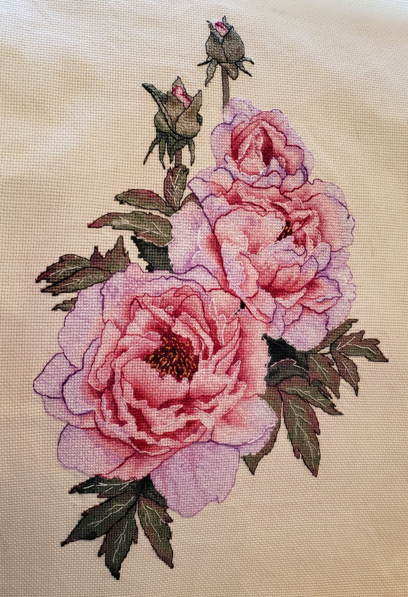 @gingermama29 I just finished a pretty peonies project (photo in spoiler) and right now I'm working on a family tree for my MIL. She's into genealogy and I found a cross stitch chart of birth month flowers, so I've drafted up a pattern with the flowers and everyone's name in it, hoping to finish it for her birthday.