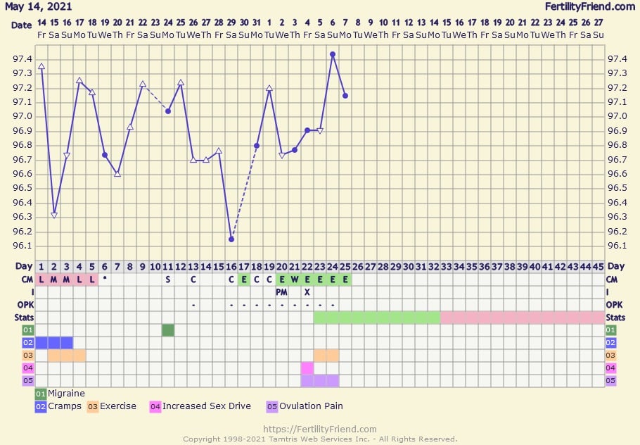 @fantasyflyte I always have EWCM after O, usually 1-2 days, but sometimes 3. Makes pinpointing O a bit more difficult if my temps are wonky! FF will give you dotted CH if you go to 3 days after, just FYI.
