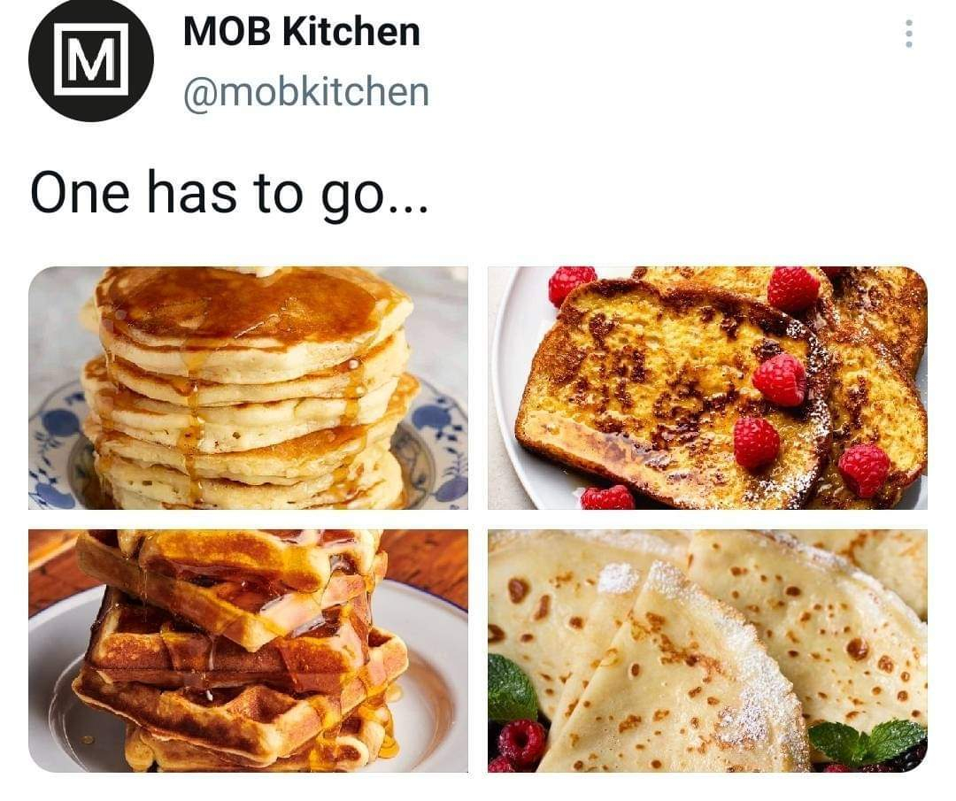 French toast, absolutely, hands down, has got to go. Soggy bread that tastes like eggs? Hellll no.