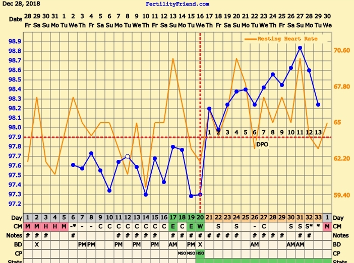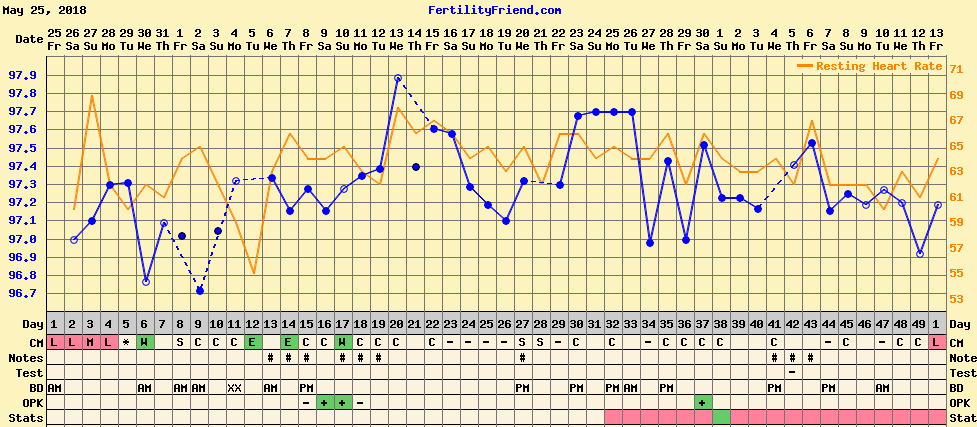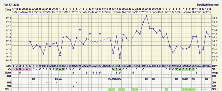 This was my last cycle before we started metformin. Two false surges, several patches of EWCM, I had stopped OPKs by this point because they weren't giving me any useful readings.