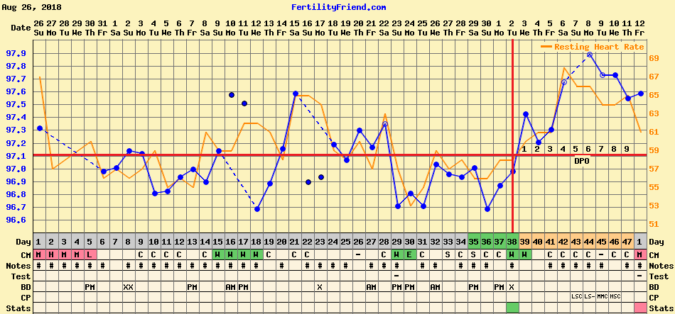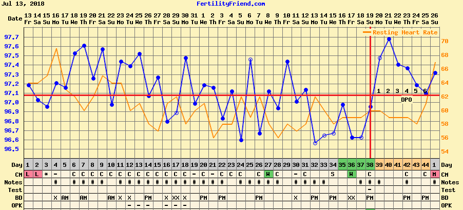 Whereas this is a regular ovulatory cycle with a temp dip and clear surge that stayed elevated above the cover line during my LP.