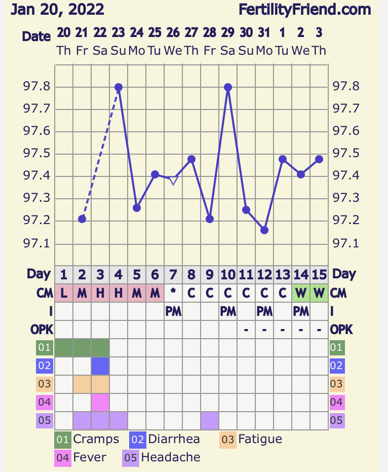 CS/Q: I'm guess today is O day given +'ve OPK yesterday + EWCM. But can't confirm with Oura temps since I had a glass of champagne and a glass of red last night with dinner and they were still working their way out of my system during the night. Either way, planning on DTD tonight.TTC History