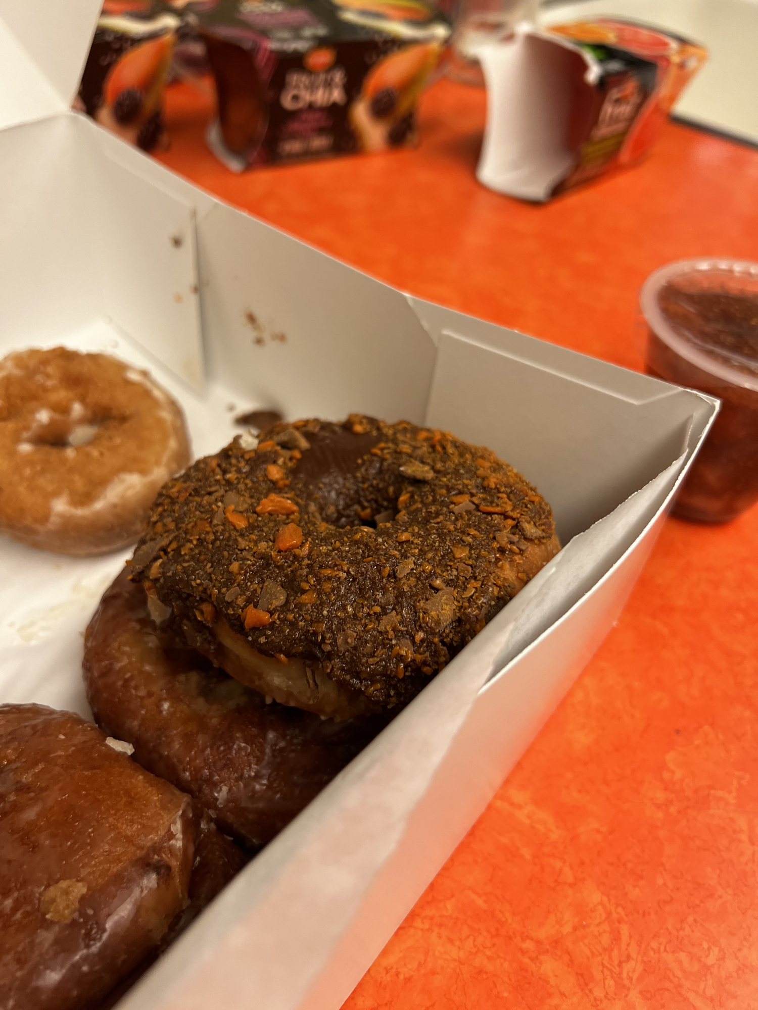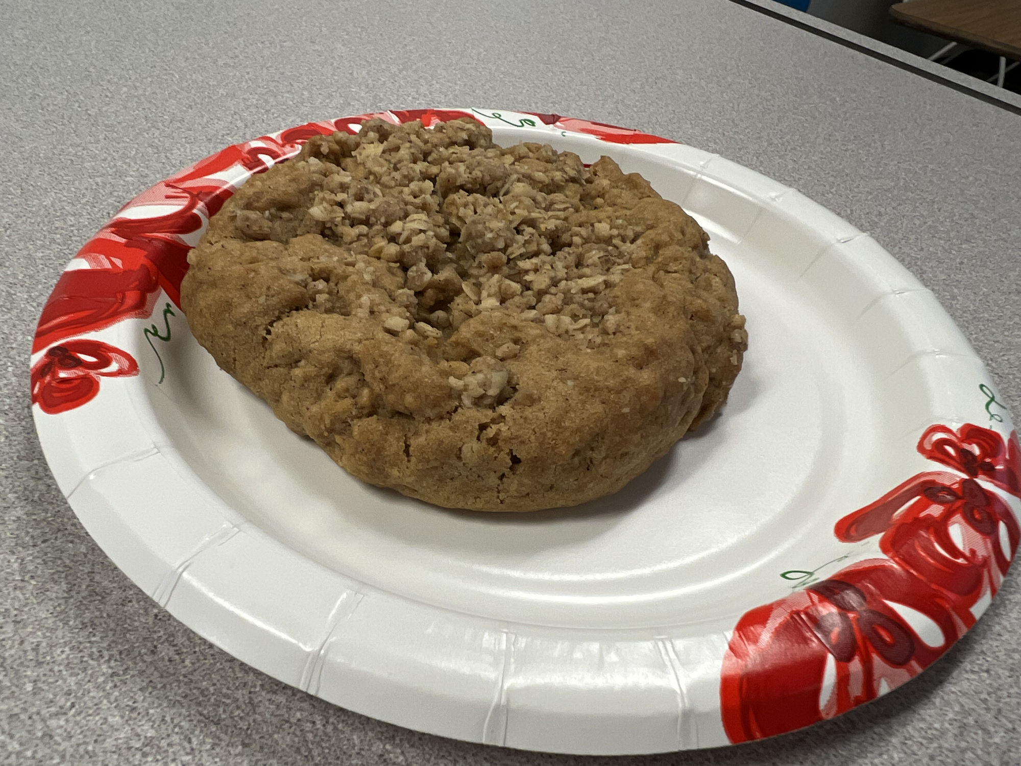 It is teacher appreciation week and yesterday, we got Crumbl cookies and muffins. Today, there are donuts and fruit cups. I grabbed two fruit cups and asked my friend, on maternity leave, if she would like a Cumbl cookie. She would, so I grabbed one.