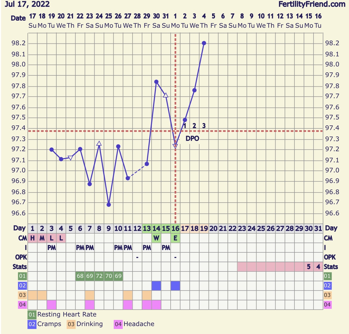 CS/Q: I had a huge temp rise this morning and FF changed my O date from CD13 to CD16, which is more in line with my regular cycle. However, I had a negative OPK on that day. Honestly my OPKs were darkest on CD11 but they were borderline positive and then just got lighter. Sooooo, who knows. I never used OPKs in the past, I usually just went by BBT, so I am a little confused on how to use them to be honest. I am attributing that spike on CD 14 to possibly drinking too much wine before bed. I will go by FF crosshairs for timing purposes I suppose. WHAT DOES IT MEAN?! Haha!