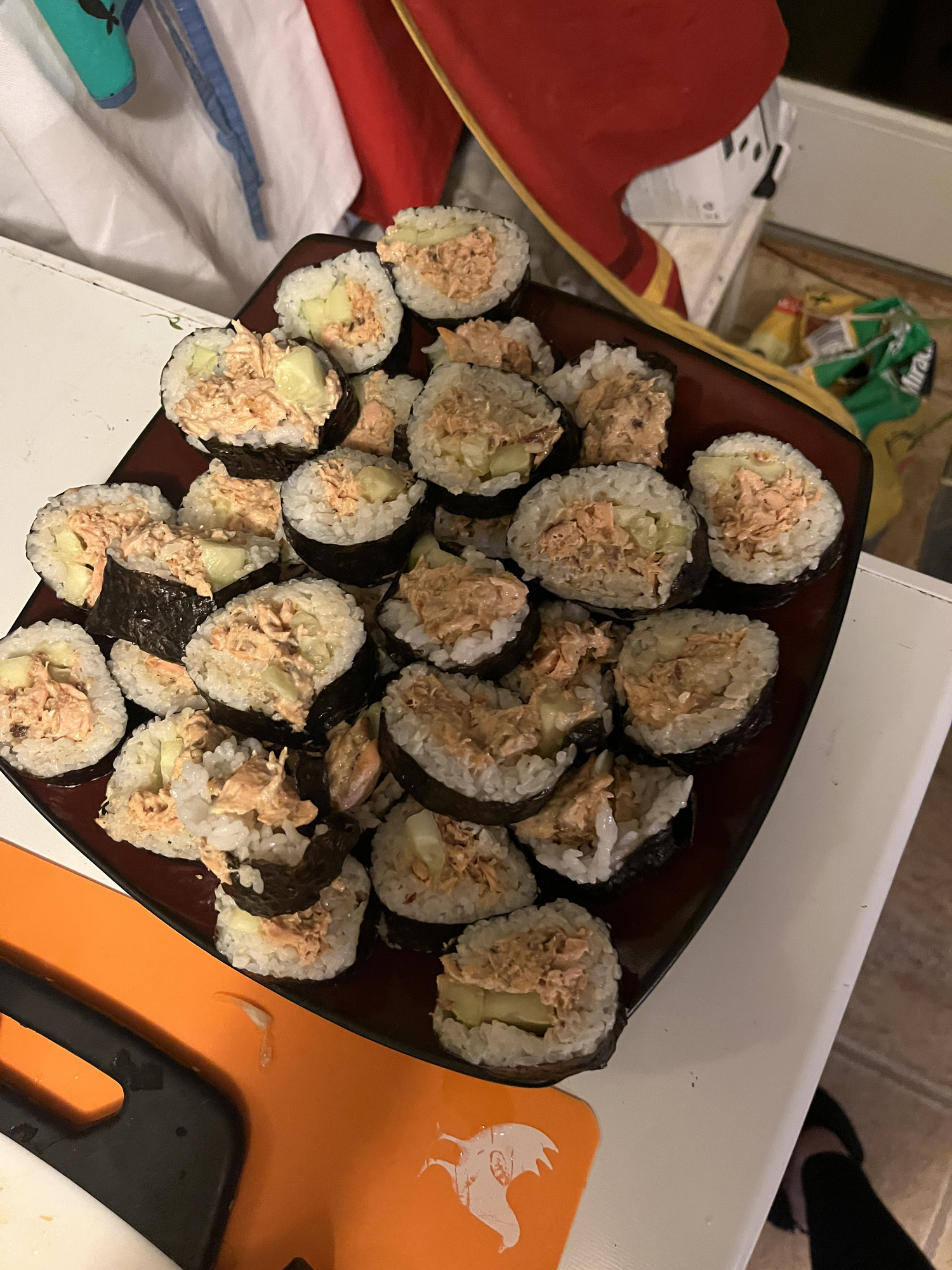 Did our annual tradition of homemade sushi for new years tonight. Not perfect but delish. Featuring cooked spicy salmon with our homemade hot sauce mixed in the mayo.